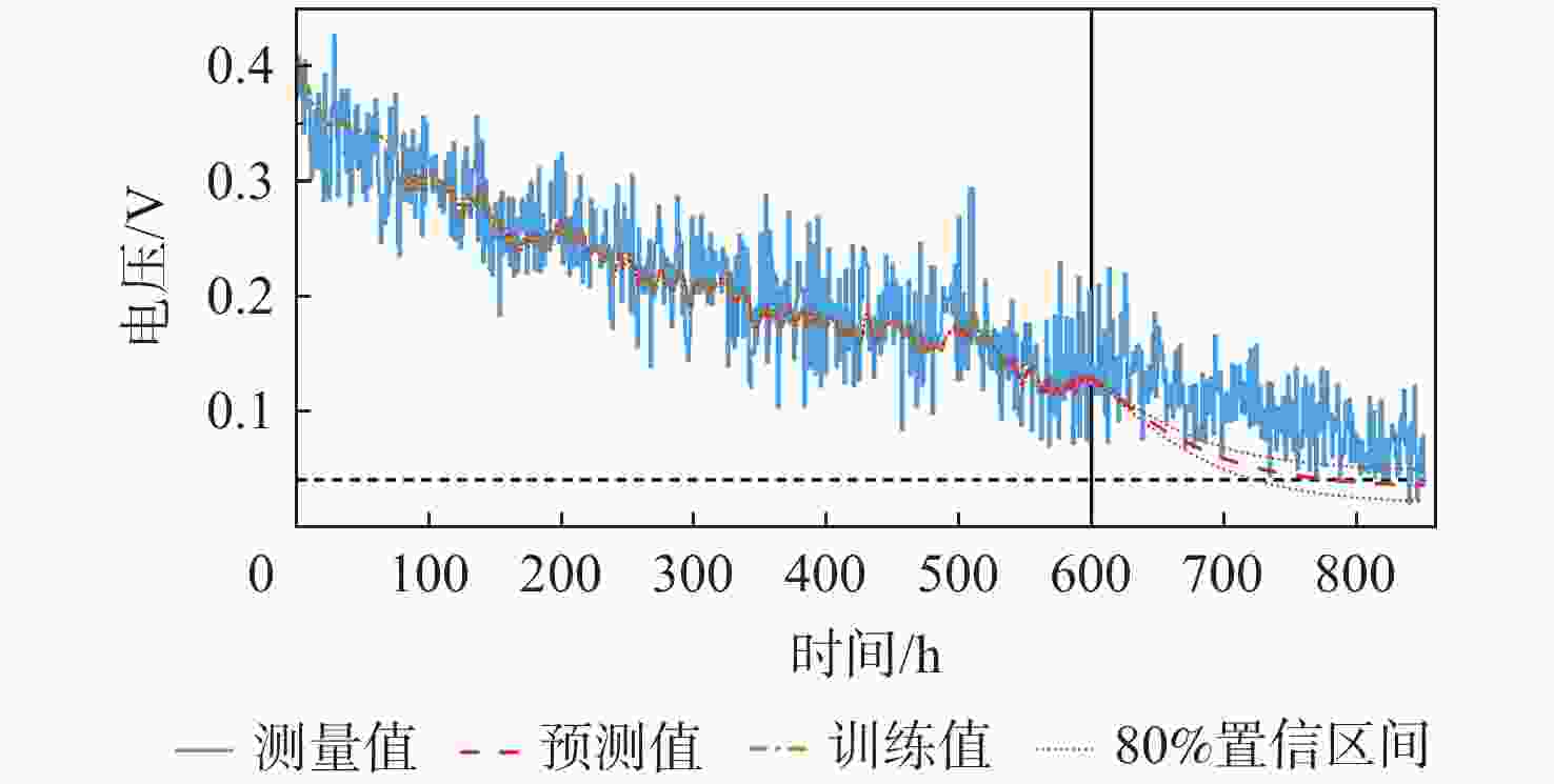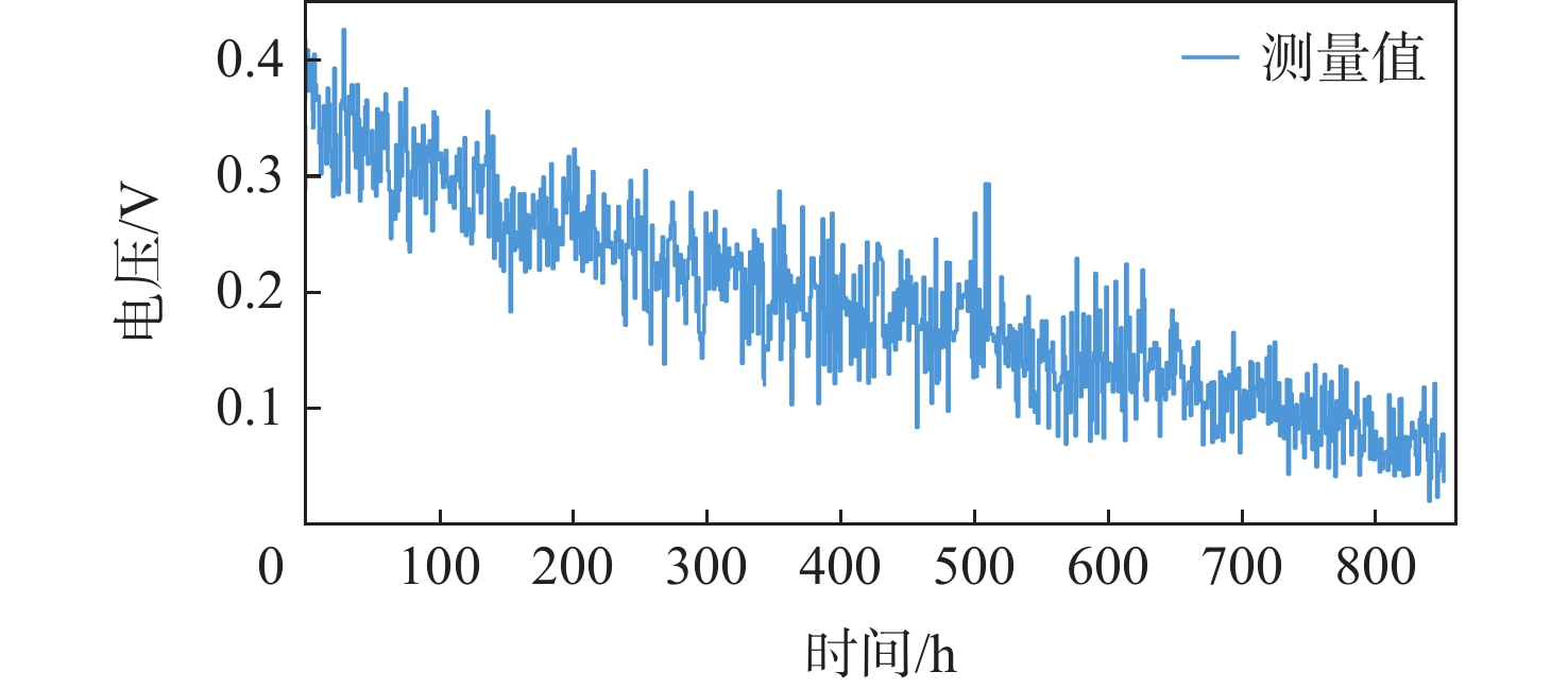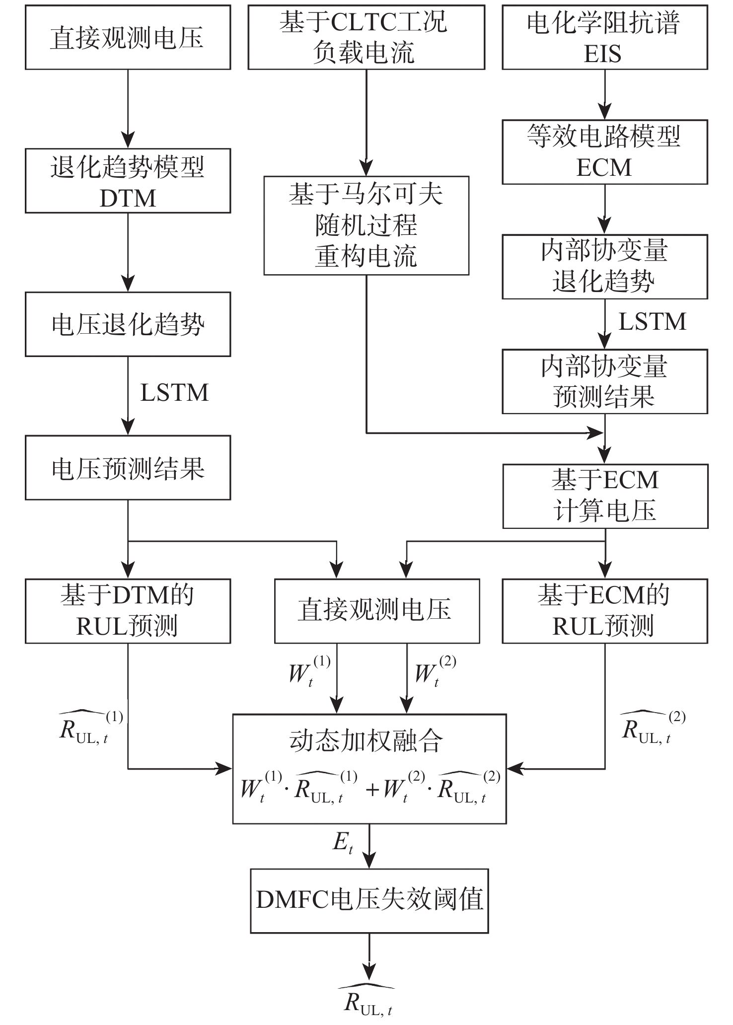 微型直接甲醇燃料电池(µDMFC)膜电极性能会随运行时间和工况衰退,影响其效率和使用寿命。准确的健康状态(SOH)估计与剩余使用寿命(RUL)预测可以确保µDMFC安全运行。输出电压的退化趋势受运行工况影响而波动,传统基于退化趋势回归的预测方法无法准确捕获这种随机变化。在数据驱动和机理模型相结合的思路下,提出基于输出电压和等效电路模型(ECM)的RUL融合预测方法。针对动态工况,引入负载电流这一退化协变量,利用随机过程重构了未来时刻的负载变化,结合ECM参量的退化趋势,实现对输出电压的准确估计和RUL预测,并在中国轻型汽车测试工况(CLTC)下进行验证。实验结果表明:基于多级退化参量的融合预测方法能更好地适应变工况,RUL预测精度、准确度分别为88.18%和85.71%,高于单一退化模型最优值3.27%和14.28%。