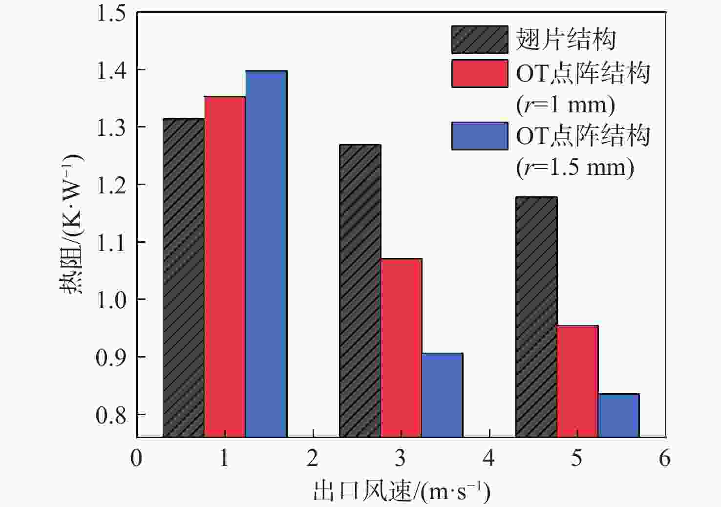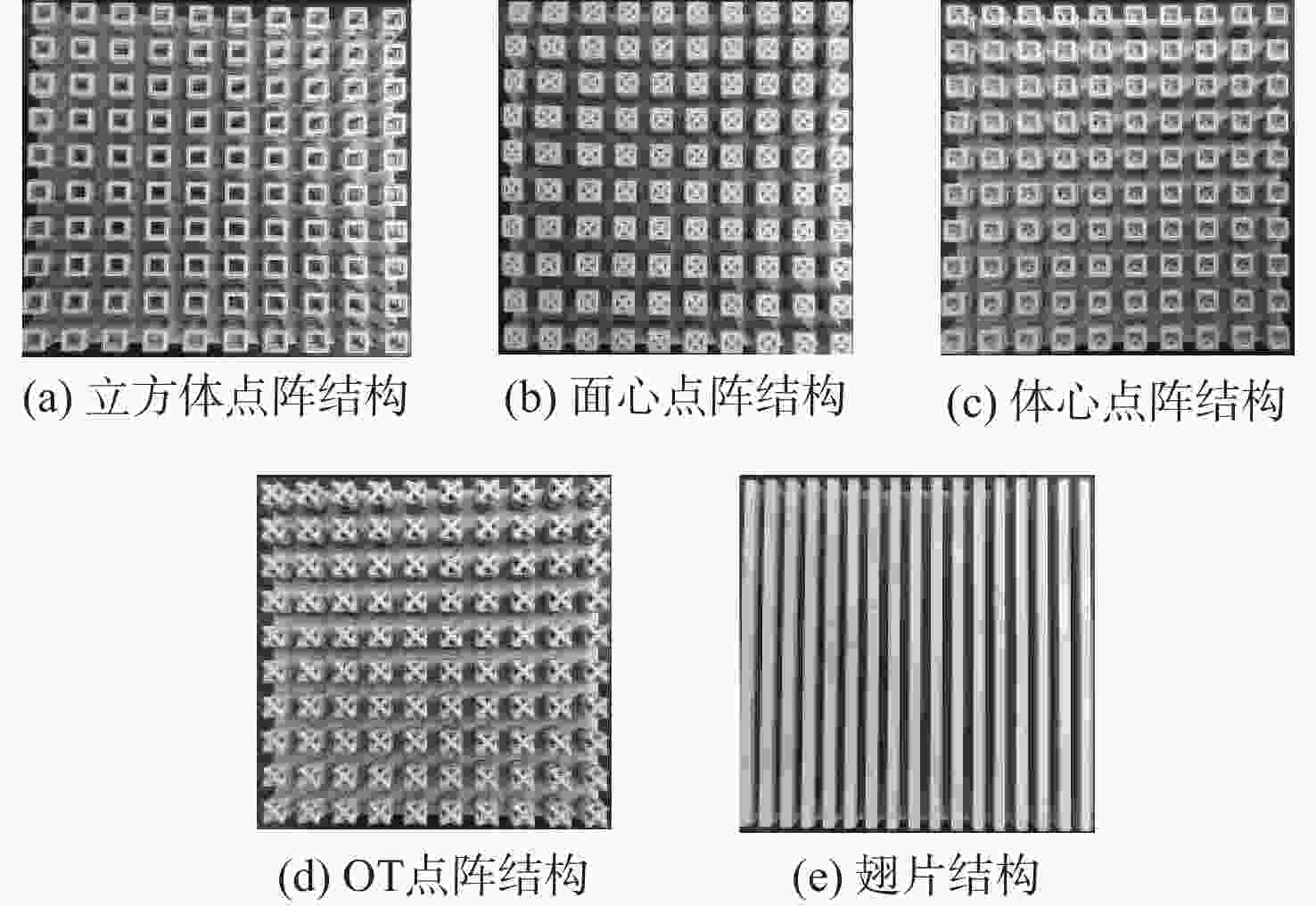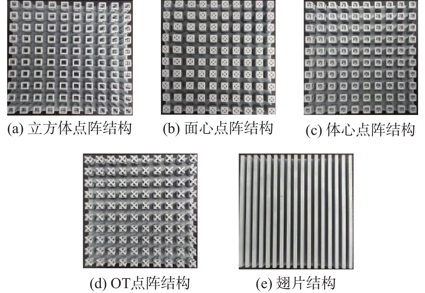 分组 出口风速/(m·s−1) 加热功率/W 杆径/mm 点阵类型 第1组 5 35 1.5 立方体点阵 5 35 1.5 体心点阵 5 35 1.5 面心点阵 5 35 1.5 OT点阵 5 35 3(翅厚) 翅片 第2组 5 35 0.5 OT点阵 5 35 1 OT点阵 5 35 1.5 OT点阵 第3组 1 35 1.5 OT点阵 3 35 1.5 OT点阵 5 35 1.5 OT点阵 表 2 测量仪器型号及参数